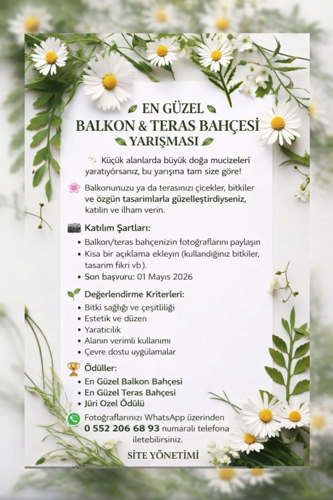 Katılım için:• Balkon/teras bahçenizin fotoğraflarını paylaşın• Kısa bir açıklama ekleyin (kullandığınız bitkiler, tasarım fikri vb.)• Son başvuru: 01 Mayıs 2026